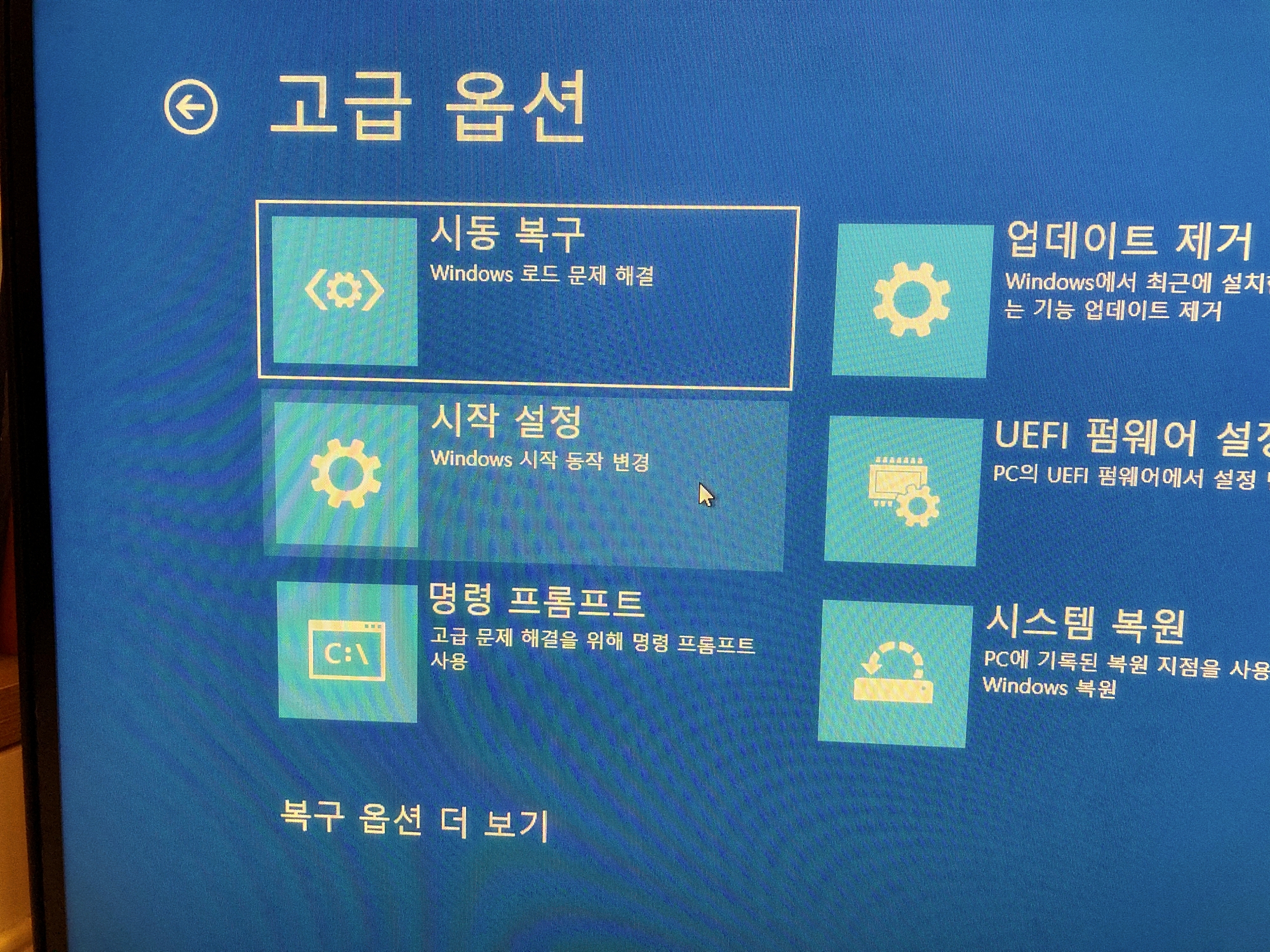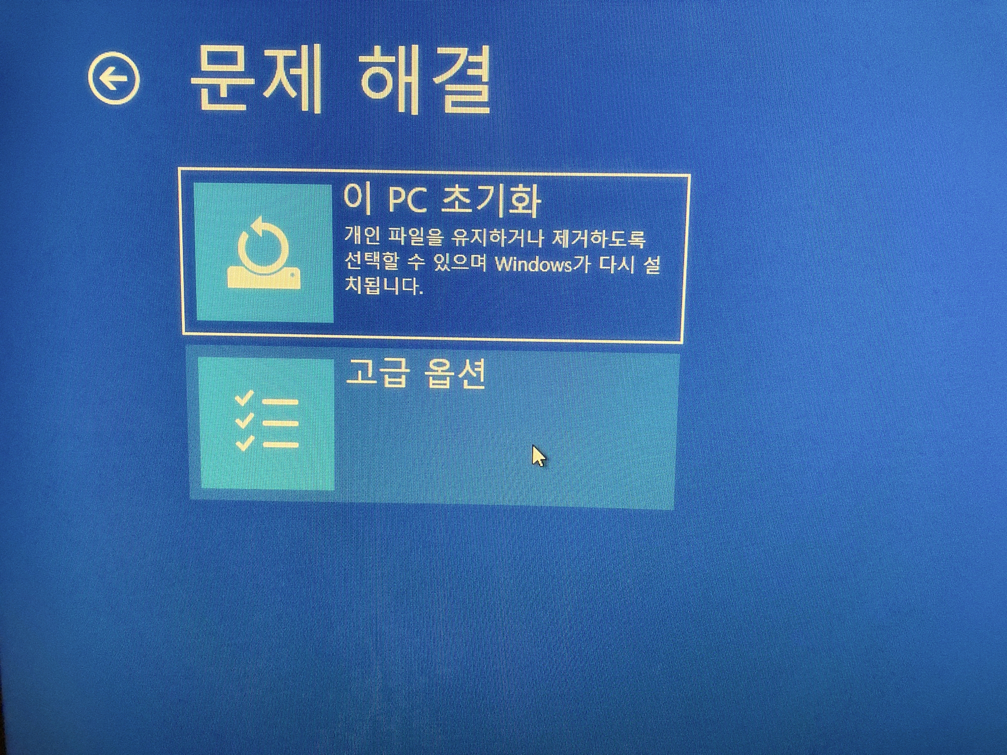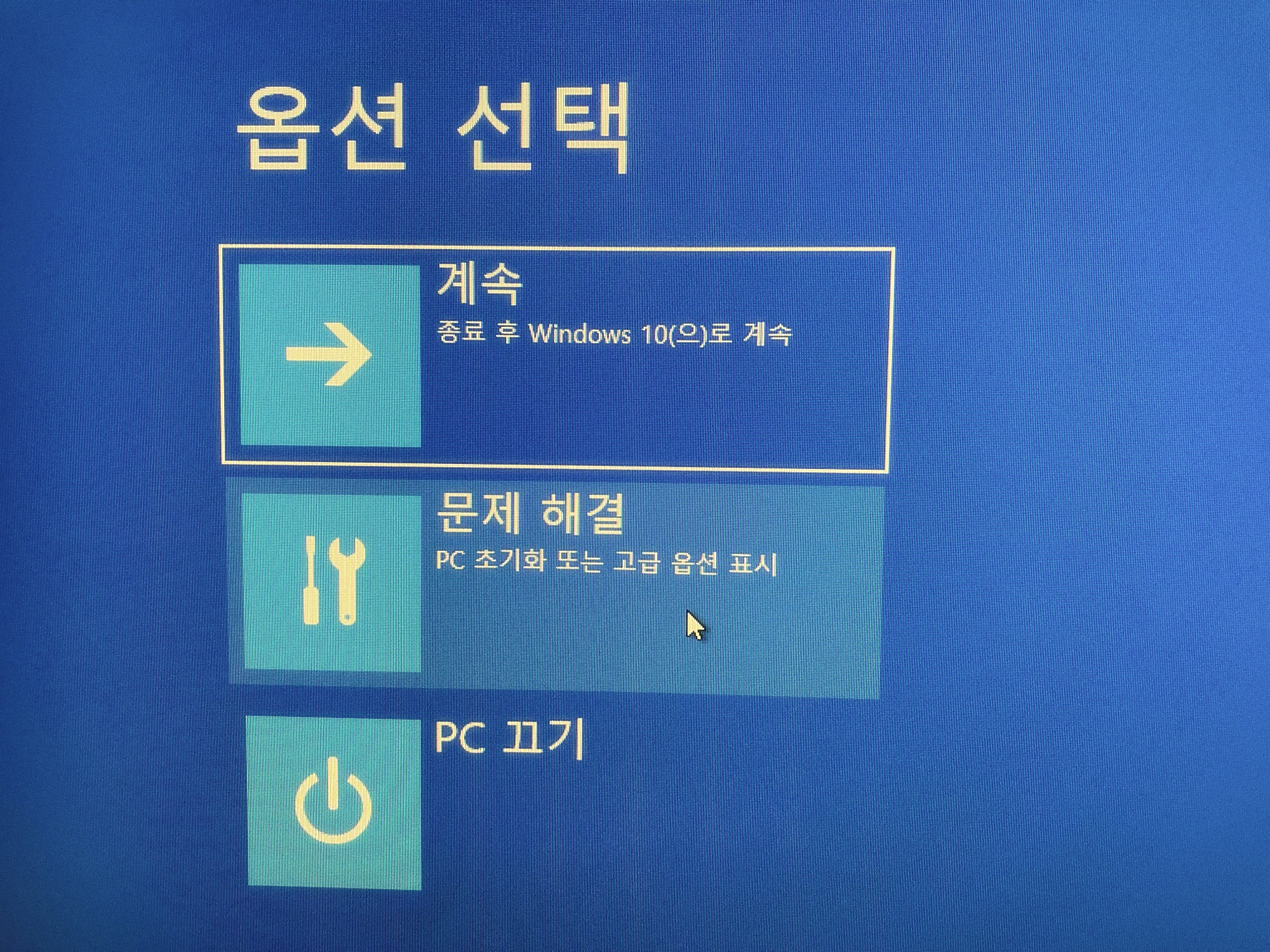 이후는 캡처 프로그램을 사용할 수 없어 화질이 좀 구겨지더라도 양해해주세요. Shift + 다시 시작을 선택하면 컴퓨터가 다시 켜질 때 옵션 선택 화면으로 들어오게 됩니다. 여기서 '문제 해결'을 선택합니다.