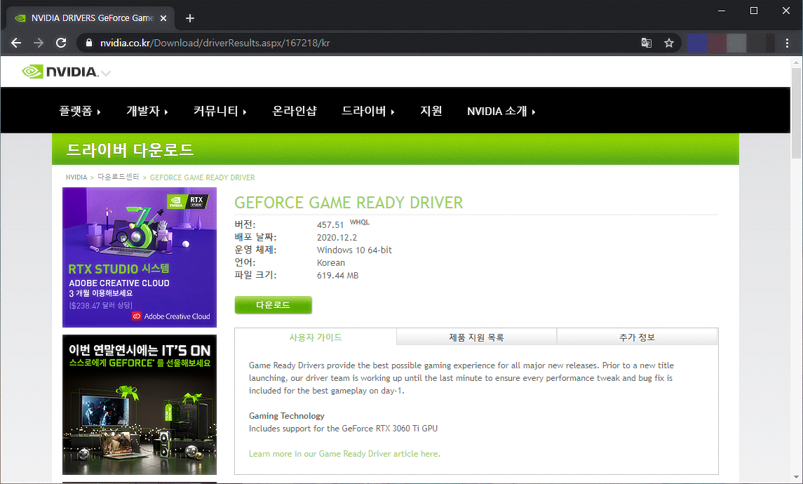 그리고 그래픽 드라이버를 삭제한 뒤엔 재설치 과정이 필연적으로 뒤따를 수밖에 없기에 미리 드라이버까지 받아주면 뒷 과정을 진행할 때 상대적으로 수월합니다.