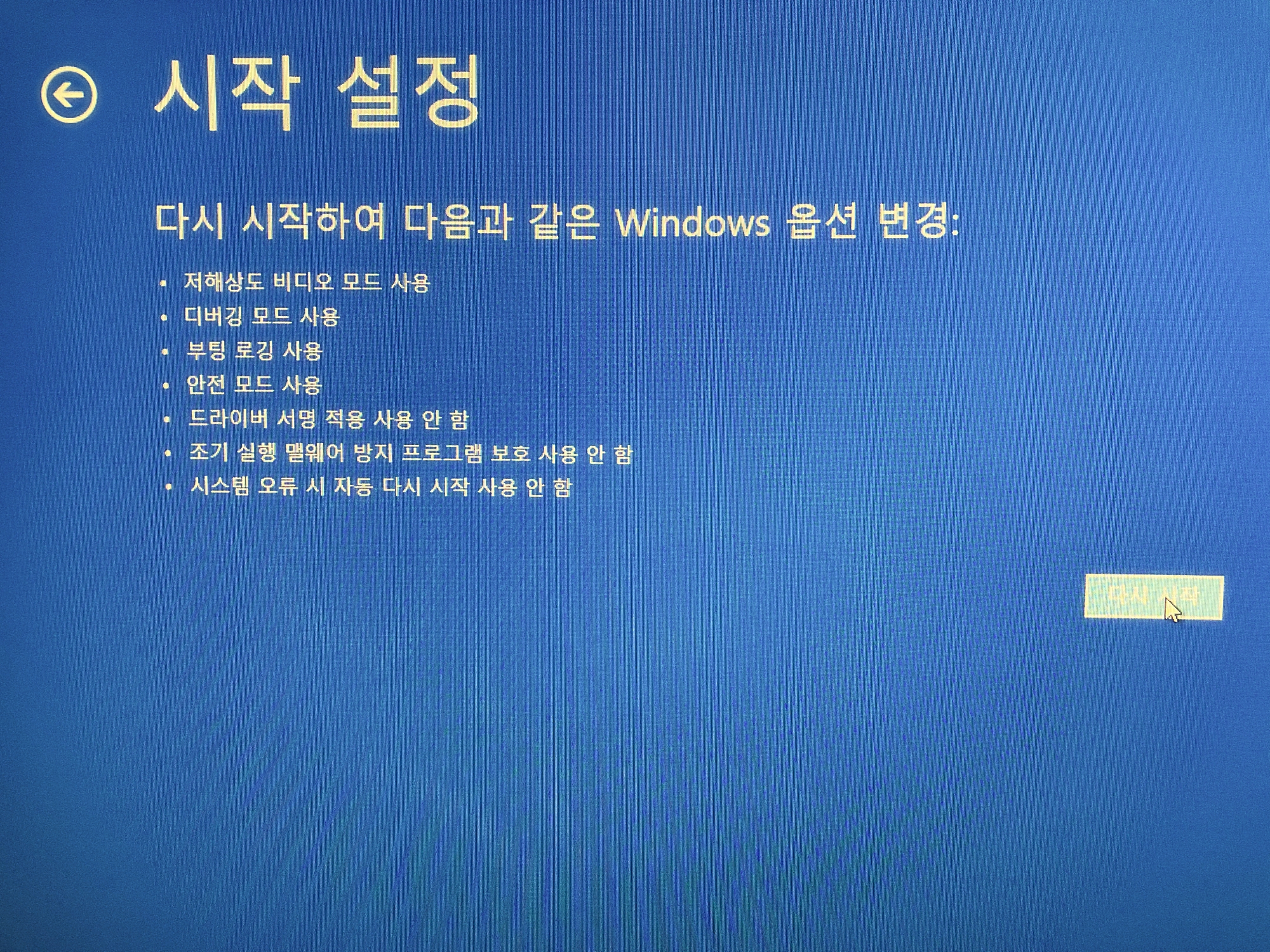 여기 목록에 보면 네 번째 항목에서 안전 모드를 확인할 수 있죠. 이 문구를 확인하고, '다시 시작'을 눌러 마저 다시 실행해주면 되겠습니다.
